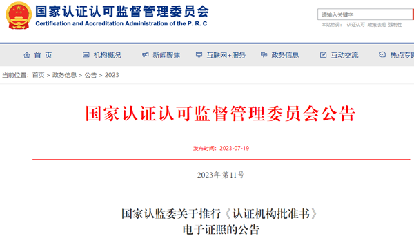 近日,國(guó)家認(rèn)監(jiān)委發(fā)布《關(guān)于推行《認(rèn)證機(jī)構(gòu)批準(zhǔn)書》電子證照的公告》,自公告發(fā)布之日起,在全國(guó)范圍內(nèi)推行應(yīng)用《認(rèn)證機(jī)構(gòu)批準(zhǔn)書》電子證照,不再印發(fā)紙質(zhì)《認(rèn)證機(jī)構(gòu)批準(zhǔn)書》,進(jìn)一步提升政務(wù)服務(wù)標(biāo)準(zhǔn)化、規(guī)范化、便利化水平。