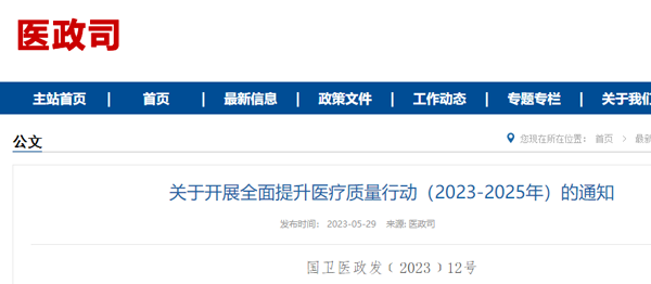 5月29日,國家衛(wèi)健委、國家中醫(yī)藥局發(fā)布《全面提升醫(yī)療質(zhì)量行動計劃(2023—2025年)》,在全國開展為期3年的全面提升醫(yī)療質(zhì)量行動,推進持續(xù)改進醫(yī)療質(zhì)量、保障醫(yī)療安全。