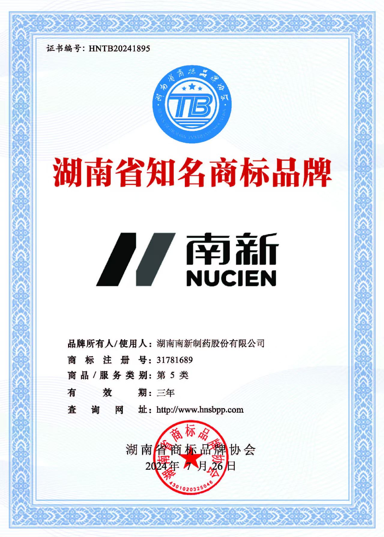 南新制藥憑借卓越的產(chǎn)品質(zhì)量和創(chuàng)新研發(fā)能力,榮獲“湖南省知名商標(biāo)品牌”,這不僅是對其品牌價值和市場影響力的充分肯定,也是對其在湖南省乃至全國醫(yī)藥領(lǐng)域所做杰出貢獻(xiàn)的高度認(rèn)可。