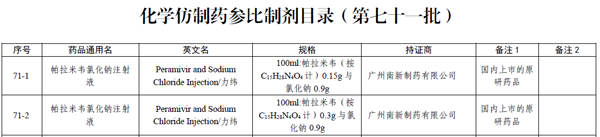 8月17日,我司的帕拉米韋氯化鈉注射液100ml:0.15g和100ml:0.3g兩個(gè)規(guī)格被國家藥品監(jiān)督管理局公布為參比制劑。
